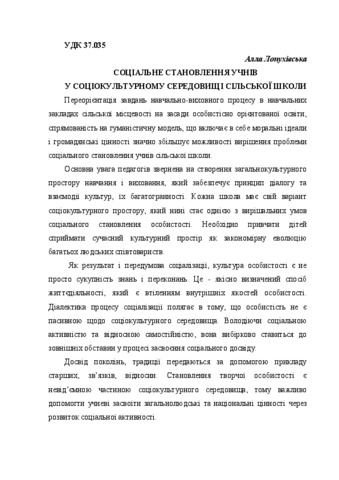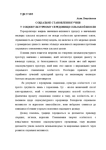 The article deals with the problem of social development of the rural school pupils. The author looked out the pupils socialization as the process of their united to the cultural values. The teacher’s tasks in the educational process, which assist the person’s realization and determination, are lighted out.