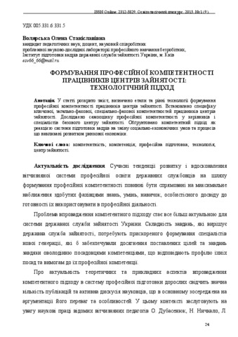 - Волярська, Олена Станіславівна (orcid.org/0000-0002-6812-1154) (2015) Formation of the of professional competence of specialists’ employment centers: the technological approach Освітологічний дискурс, 1 (9). pp. 13-23. ISSN 2312-5829 (Online)