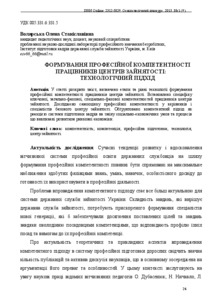 In article defines the content, stages and levels of professional competence formation technology of employees’ employment centers. The specificity components of professional competence of employees’ employment centers. The investigation of assessing the professional competence of employee’s local employment centers. Proved a competency based approach as a reaction personnel training system to change social and economic conditions and the processes that are caused by development of a market economy.