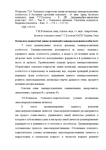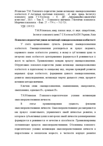 - Яблонська, Тетяна Миколаївна (2015) Psychological and pedagogical condition of person’s self-perfection activation Актуальні проблеми психології (27). pp. 712-721. ISSN 2072-4772