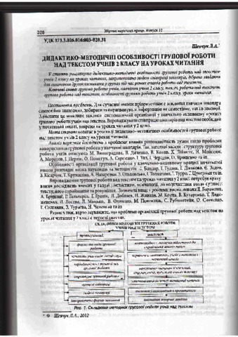- Шевчук, Л.М. (2012) Didactic and methodical peculiarities of a group activity at a text on Reading lessons by 2-nd form students Педагогічна освіта: теорія і практика, 11. pp. 328-332.