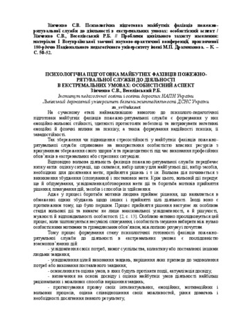 - Зінченко, Світлана Володимирівна and Веселівський, Р.Б. (2015) Psychological preparation of the future specialists of fire and rescue service to work in extreme conditions In: The problems of civil protection: current realukraine: materials of I all-Ukrainian correspondence scientific-practical conference . НПУ ім. М.П. Драгоманова, м.Київ, Україна, pp. 50-52.