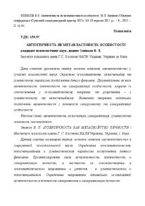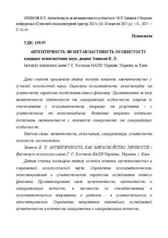 - Зливков, В.Л. (orcid.org/0000-0002-8404-8866) (2015) Authenticity In The Context Metaproperty of the Personality Сучасний соціокультурний простір. pp. 82-89.