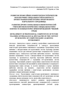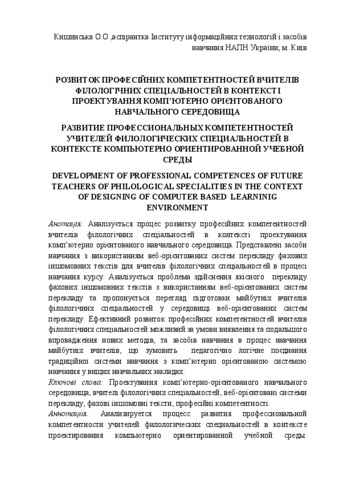 - Кишинська, О.О. (2015) Development of professional competences of future teachers of philological specialities in the contexs of designing of computer based learning environment Гуманітарний вісник ДВНЗ “Переяслав-Хмельн. держ. пед. ун. ім. Г. Сковороди”. Тематичний випуск “Вища освіта України у контексті інтеграції до європейського освітнього простору”, 36/1 (63/3). pp. 365-374.