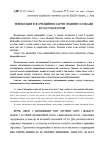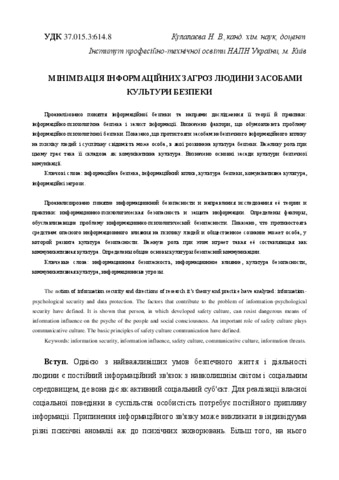 - Кулалаєва, Наталя Валеріївна (2015) Мinimization of information threats to human security by means of culture Збірник наукових праць Львівського державного університета безпеки життєдіяльності (4). pp. 27-30. ISSN 2411-4685
