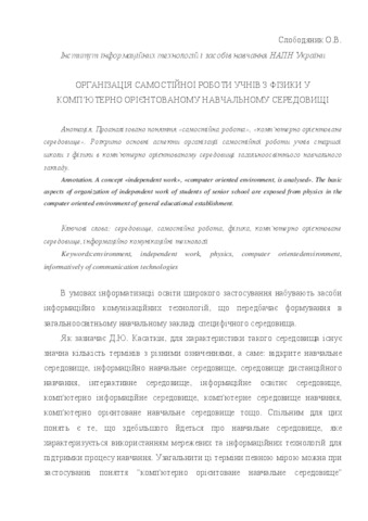 - Слободяник, О.В. (2015) Organization of independent work of students is from physics in the computer oriented educational environment Наукові записки КДПУ ім.В.Винниченка. Серія: Проблеми методики фізико-математичної і технологічної освіти, 2 (8). pp. 135-141. ISSN 978-966-7406-67-7