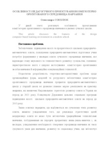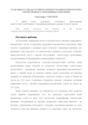 - Соколюк, О.М. (2015) Features of the pedagogical planning of the computer oriented environment of studies Наукові записки Кіровоградського державного педагогічного університету. Серія: Проблеми методики фізико-математичної і технологічної освіти, 2 (8). pp. 47-53. ISSN 978-966-7406-67-7