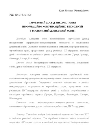 - Носенко, Ю.Г. and Матюх, Ж. В. (2015) Foreign experience of using ICT in inclusive preschool education Нова педагогічна думка, 4. (In Press)