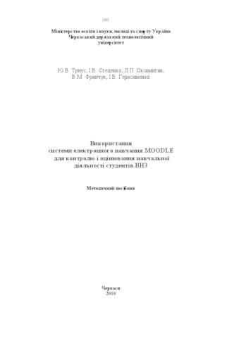 Триус, Ю.В., Стеценко, І.В., Герасименко, І.В. and Франчук, В.М. (orcid.org/0000-0002-9443-6520) (2010) Using еlectronic learning system MOODLE for control and evaluation of training activities of high schools students . МакЛаут, м.Черкаси, Україна.