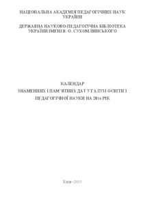 Філімонова, Тетяна Віталіївна and Тарнавська, Сніжана Вікторівна (2015) Calendar of memorable and remarkable dates in education and pedagogy for 2016 . Державна науково-педагогічна бібліотека імені В. О. Сухомлинського, м.Київ, Україна.