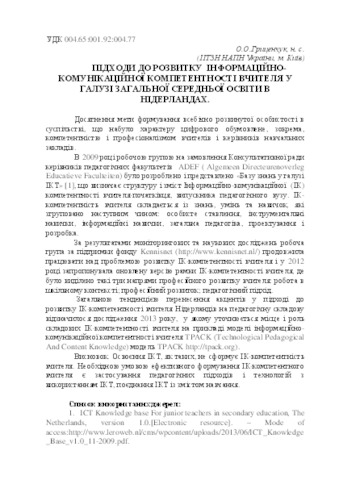 - Гриценчук, О.О. (2015) Development of approach information communication competence of teachers in education in general secondary in the Netherlands In: Мультимедійні технології в освіті та інших сферах діяльності . НАУ, м. Київ, Україна.