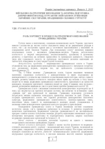 The aspects of children and young people education (in particular patriotic education) by means of Horting - Ukrainian national kind of sport are considered in the article. Potential of Horting was investigated as a factor of patriotic education of citizens. The program of military-patriotic education within trainings of Hortingin public schools was also considered as the basis for national-patriotic upbringing of the younger generation, patriotic identity formation and sustained motivation to create the conditions for safe living and healthy lifestyle, as well as ability for self-protection and to protect others in emergency cases. The methods for military-patriotic education of youth, which the Horting Federations together with the Cossack and other patriotic organisations use in their practice, have been analysed.Special attention is paid to the methods of successful educational work on military-patriotic education by means of Horting used by the trainers; work with parents and recommendations on military-patriotic upbringing in a family.