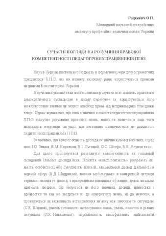 - Радкевич, О.П. (2014) Current views on the understanding of the legal competence of of pedagogical employees of vocational schools In: Scientific and methodological support professional education and learning, 24-25 березня 2014, м.Київ, Україна.