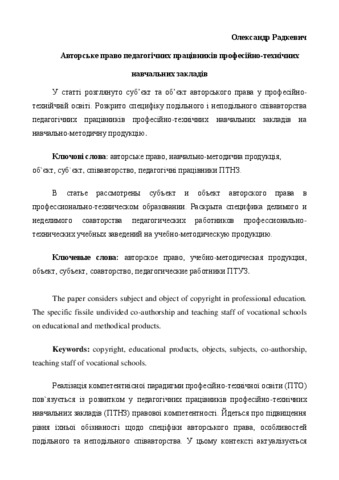 - Радкевич, О.П. (orcid.org/0000-0002-2648-5726) (2014) Legal competence of pedagogical workers vocational and technical educational institutions for jurisdictional forms of protection of copyright Vocational and technical education, 4 (65). pp. 35-38.
