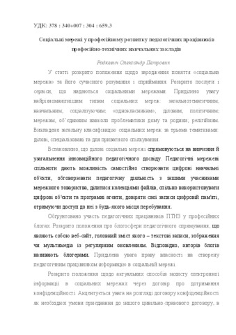 - Радкевич, О.П. (2014) Social networks for the professional development of pedagogical staff in VET schools. Науковий вісник Інституту професійно-технічної освіти НАПН України. Професійна педагогіка, 8. pp. 81-87.