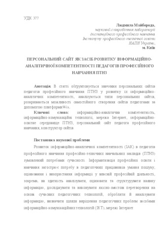 - Майборода, Людмила Анатоліївна (2015) Personal site as a means of information-analytical competence of teachers of vocational training VET Теорія і методика професійної освіти (8).