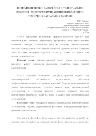 - Радкевич, О.П. (orcid.org/0000-0002-2648-5726) (2015) The сivil legal protection of intellectual property pedagogical staff of professional-technical schools Професійно технічна освіта, 3 (68). pp. 51-54.