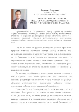 - Радкевич, О.П. (2015) Legal competence of pedagogical workers of professional educational institutions with intellectual property protection In: Розвиток інформаційної культури керівників професійно-технічних навчальних закладів, 28 вересня 2015 р., м.Київ, Україна.