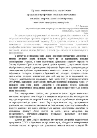 Reveals that the legal competence of of pedagogical workers in of VET institutions of health and protection of photo, video teaching materials lies in the knowledge of the Berne Convention, the law of Ukraine "On Copyright and Related Rights" and Art. 307, 308, 437 of the Civil Code of Ukraine.