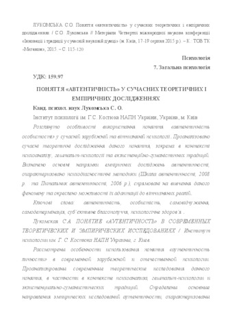 - Лукомська, Світлана Олексіївна (orcid.org/0000-0002-0360-6484) (2015) Concept "authenticity" in modern theoretical and empirical researches Матеріали Четвертої міжнародної наукова конференції «Інновації і традиції у сучасній науковій думці» (17-19 серпня 2015 р., м.Київ, Україна). pp. 115-120.