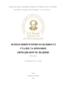 The collective monograph, prepared by the scientists of the Laboratory of General and Ethnic Psychology of Kostiuk Institute of Psychology of the NAPS of Ukraine, studies the most common conflict situations that cause emergence of crisis phenomena in various aspects of person’s inner world; defines types of conflicts that arise as a result of the above situations; discusses negative signs of crises due to different types of conflicts. Dynamics of these conflicts is investigated. Subjective and objective factors of appearance of crisis periods during personality formation are determined and discussed. A conceptual framework of the study is presented in the monograph. Conflicts that arise during formation of different aspects of a personality are analyzed from the psychological point of view and classified. It is proved that crucial age crises are a source of personal development; they require changing of persons’ attitudes to themselves and their lives, rebuilding of the self-regulation system. The monograph shows how adequate vision of persons’ own life stimulates searches for constructive crisis overcoming and mobilizes internal resources for specific evolutionary changes in life. The book is addressed to psychologists-scientists and practicing psychologists, teachers, educators, post-graduate students, students of universities.