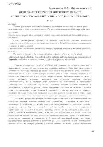 - Комаровська, О.А. and Миропольська, Н.Є. (orcid.org/0000-0002-7469-5111) (2013) Assessment for learning the art as a means of personal development of the student primary school age Науковий часопис НПУ ім.М.П.Драгоманова, 14 (19). pp. 190-195.