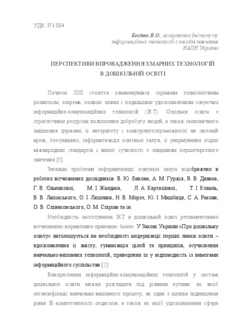 - Богдан, В.О. (2014) Prospects of the introduction of cloud technology in preschool education In: Матеріали ІІ Всеукраїнської науково-практичної конференції молодих учених «Наукова молодь-2014» . Інститут інформаційних технологій і засобів навчання НАПН України, м.Київ, Україна, pp. 8-10.