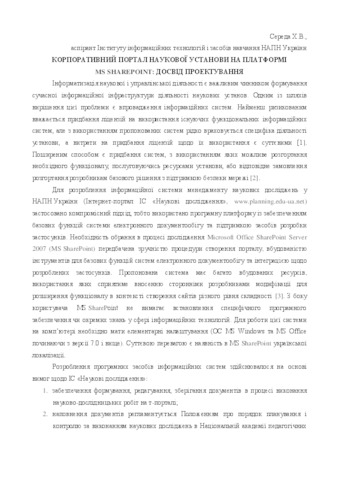 - Середа, Х.В. (orcid.org/0000-0002-4510-7173) (2015) Corporate portal of scientific institution on MS SharePoint platform: experience of design In: Звітна наукова конференція Інституту інформаційних технологій і засобів навчання НАПН України 2015 р. . ІІТЗН НАПН України, м. Київ, Україна, pp. 49-51.