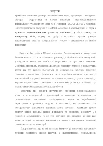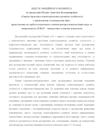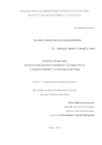 Informatization and globalization of the contemporary social processes, which cause changes in the area of intersection and interaction of the personal and the social in man are particularly important in the period of adolescence, which is especially sensitive to social changes and the specific historical circumstances of the development of society. The author presents the results of empirical operationalization and validation of the concept of psychosocial development. The paper reveals the theoretical and methodological approaches to study the phenomenon of the concept of psychosocial development; definition of its psychological content, patterns, structure and dynamics in the period of adolescent age. The concept represents the author’s vision of the concept of psychosocial development. The work presents the philosophical and psychological substantiation of the essence of psychosocial problems and categories of psychosocial development at all levels of analysis: the level of philosophical methodology, the level of general scientific principles and forms of research, the level of concrete scientific methodology, the level of psychological methods and techniques of research. Psychosocial development is viewed as the concept of the integrative type; its operationalization is based on the rational-empirical strategy of data collection. The author implements the requirement of unity of methodology, theory and experiment. Adolescence is considered as a category, the phenomenon and the problem of developmental psychology in various aspects of the analysis (phenomenological, ontological, functional, genetic). The new understanding of the nature of adolescence (12 to 20 years) as a cultural and historical phenomenon is related to overcoming of limitations of traditional socio-historical paradigm. In new social and cultural conditions the modern type of adolescence is the age group, which (as humanity in general) develops historically, universalizes ancestral ability of mankind, promotes the development of human society in the cultural space of time and history. Development of the modern teenager is a process of creative self-determination in the culture: on the one hand -it’s a creative assimilation (assignment), on the other -it’s the creation and enhancement of the creative potential of the genus, the actualization of not only realized, but also undetected, latent potential of the creative activity of mankind. Thus, adolescence is a carrier of cultural -creative function and source of tribal cultural evolution. The author’s idea about new characteristics of modern adolescence is confirmed in the research method of focus groups (focus groups of teachers). Postnonclassical paradigm and pluralistic methodology of knowledge determine the disciplinary blurring and increase of the role of the analysis of socio-cultural context in the study of psychological phenomena. Conceptualization of psychosocial development in the period of adolescence (mechanisms, patterns, age and individual tasks) are interpreted in the context of solving functional dichotomies of psychosocial development as a search for individual and distinctive balance of individual and social, internal and external, determination and selfdetermination. The author presents the results of empirical operationalization and validation of the concept of psychosocial development. There is described methodological support, organization, tools and phases of the empirical research of psychosocial development in the period of 12 – 20 years, are presented the results of development and standardization of the author’s questionnaire “Psychosocial Development of Adolescents” (PDA). The empirical way of data collection and their further generalization allowed to determine patterns of psychosocial development in conditions of socialization, to describe the characteristics of the psychosocial development of modern Ukrainian adolescents and young people, their potential and individual problems of growing up. The problems in resolving the dichotomies of psychosocial development lead to manifestations of crisis: a crisis of identity, crisis of the subject. There are presented the results of researching the peculiarities of normative experiences of the crisis, are described predictors of normative crisis of psychosocial development, its individual, personal-biographical and age factors. Qualitative variability of the content of psychosocial development in the period of adolescence (secondary school students) and youth (students) ages are presented by types (patterns) psychosocial development (harmonious, internal, dependent, frustrated), which are interpreted as models of development (constructive, non-constructive, destructive). Unproductive models of psychosocial development provide a definition of social and psychological conditions of promote psychosocial development in adolescence. Therefore, in the last chapter are discussed the key aspects of optimal psycho-pedagogical support of the individual in the period of growing up that should promote adequate development of adolescents and youth as subjects of social life.