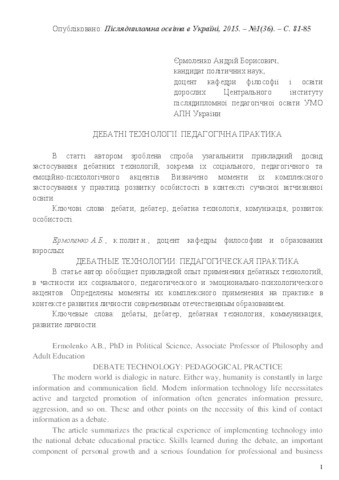 - Єрмоленко, А.Б. (2015) Debate technology: pedagogical practice Післядипломна освіта в Україні, 1 (36). pp. 81-85.