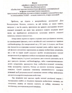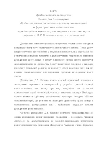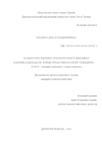 - Носенко, Діна Володимирівна (2015) Personality precursors of self-handicapping as а form of proactive coping behavior Dissertation candidate thesis, Дніпропетровський національний університет імені Олеся Гончара.