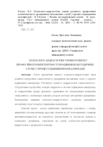 - Катюк, Я. Л. (2015) Рsychological-andragogical conditions of professional competence development of methodological service employees in a process of advanced training Вісник післядипломної освіти, 12 (25). pp. 80-90. ISSN 2218-7650