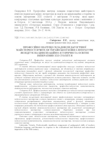 - Сидоренко, В.В. (2014) Professionally significant components of pedagogical skills of teachers Ukrainian language and literature in response to the civilizational and historical and educational imperatives of the XXI century Наукові записки Національного університету «Острозька академія». Серія «Психологія і педагогіка» (29). pp. 90-96.