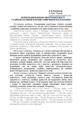 - Васильєва, Д.В. (2015) Forming financial knowledge of senior pupils in the process of study of mathematics In: Проблеми та перспективи фахової підготовки вчителя математики : збірник наукових праць за матеріалами Міжнарод. наук.-практ. конф. 26 – 27 листопада 2015 р. . Планер, м. Вінниця, Україна.
