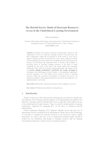 Nowadays, the search for innovative technological solutions to the organization of access to electronic learning resources in the university and their configuration within the environment to fit the needs of users and to improve learning outcomes has become key issues. These solutions are based on the emerging tools among which cloud computing and ICT outsourcing have become very promising and important trends in research. The problems of providing access to electronic learning resources on the basis of cloud computing are the focus of the article. The article outlines the conceptual framework of the study by reviewing existing approaches and models for the cloud-based learning environment’s architecture and design, including its advantages and disadvantages, and the features of its pedagogical application and the experience of it. The hybrid service model of access to learning resources within the university environment is described and proved. An empirical estimation of the proposed approach and current developments in its implementation are provided.