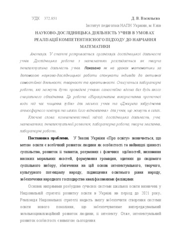 - Васильєва, Д.В. (2016) Organization of pupils’ research activity in the conditions of realization of the competence approach to teaching mathematics Педагогічні науки : теорія, історія, інноваційні технології, 2 (56). pp. 35-47.