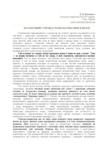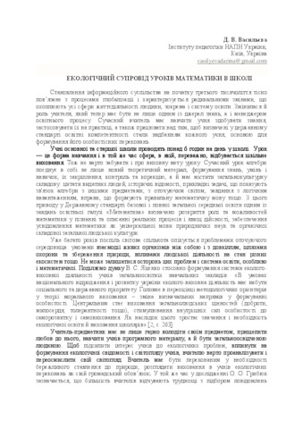 - Васильєва, Д.В. (2015) Ecological support of mathematics lessons at school In: Матеріали Міжнародної науково-методичної конференції «Проблеми математичної освіти» (ПМО – 2015), ( м.Черкаси, 4 – 5 квітня 2015 р.) . ЧНУ ім. Б. Хмельницького, м.Черкаси, Україна, pp. 160-162.