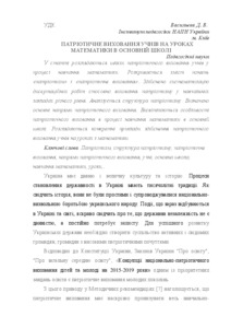 - Васильєва, Д.В. (orcid.org/0000-0002-4083-681X) (2015) Patriotic education of pupils at mathematics lessons in the basic school Науковий часопис НПУ імені Н.П. Драгоманова. Серія №3. Фізика і математика у вищій і середній школах (15). pp. 21-27.