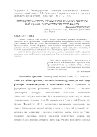 - Сидоренко, В.В. (2014) Linguodidactic technology cooperative learning: a retrospective analysis Українська мова і література в школі (7). pp. 19-26.