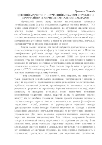 In theses outlined the main challenges facing marketing managers use technology to manage VET. Educational marketing as a modern management mechanism of vocational and technical educational institution will help bring in line educational offer to the existing logistical, methodological framework and human resources, promote the development of social partnership with leading companies, mobile to the demands of employers, create a positive image of the educational institution. Also highlights some of the results of the experimental work for the development of educational marketing in vocational education Cherkasy region.
