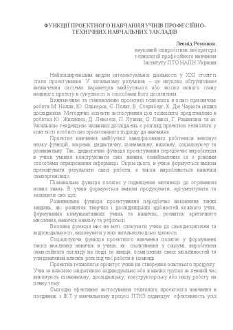 - Романов, Л.А. (2015) The functions of project-based learning students of vocational schools In: Матеріали Звітної науково-практичної конференції Інституту професійно-технічної освіти НАПН України (26 березня 2014 р.) , 1 . Інститут професійно-технічної освіти НАПН України, м.Київ, Україна, pp. 152-153.