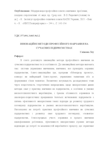 - Леу, Сніжана Олексіївна (orcid.org/0000-0001-8616-1005) (2015) Innovative methods of workforce development of an enterprise under modern conditions Модернізація професійної освіти і навчання: проблеми, пошуки і перспективи, 1 (6). pp. 143-154.