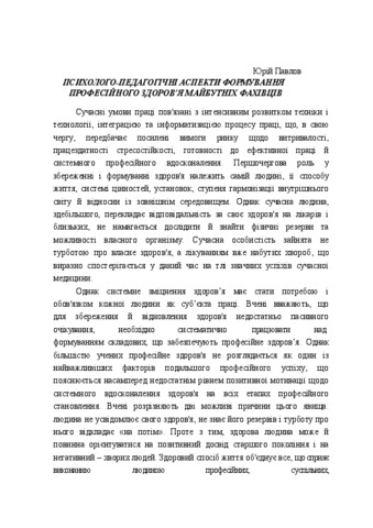 - Павлов, Ю.О. (2013) Psychology and pedagogical aspects of forming of professional health of future specialists In: Науково-методичне забезпечення професійної освіти і навчання: матеріали звітної науково-практичної конференції (м. Київ, 28 березня 2013 р.) , 1 . ІПТО НАПН України, м.Київ, Україна, pp. 167-170.
