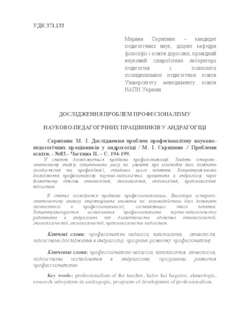- Скрипник, М.І. (2015) Studies of professionalism of teaching staff in andragogic Проблеми освіти, 2 (83). pp. 194-199.