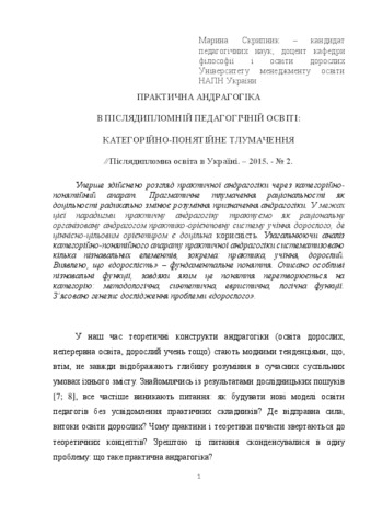 - Скрипник, М.І. (2015) Practical andragogics in Postgraduate Education: conceptual interpretation of сategories Післядипломна освіта в Україні, 2.