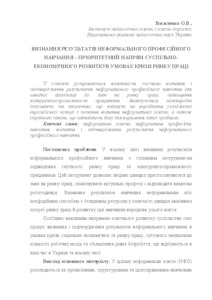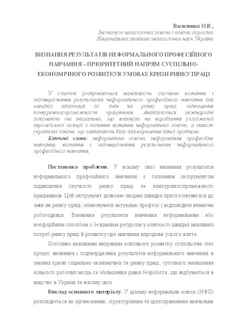 - Василенко, Олена Вікторівна (2015) Recognition of non-formal vocational training - a priority of socio-economic development in the labor market crisis Актуальні проблеми професійної орієнтації та професійного навчання населення у контексті подолання кризи ринку праці, 1 (1). pp. 85-91. ISSN ISBN 978-617-649-042-5