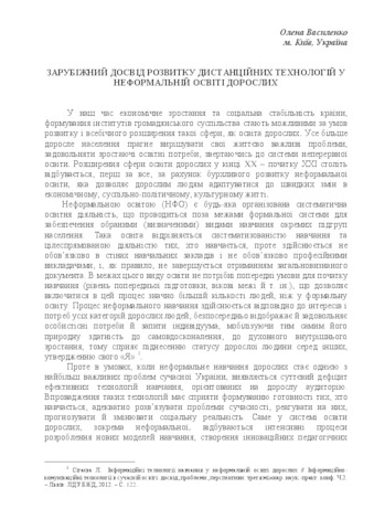 - Василенко, Олена Вікторівна (2015) Foreign experience of distance learning technologies in the non-formal adult education Європейський Союз – Україна: освіта дорослих, 1 (1). pp. 100-107. ISSN ISBN 978-617-640-200-8