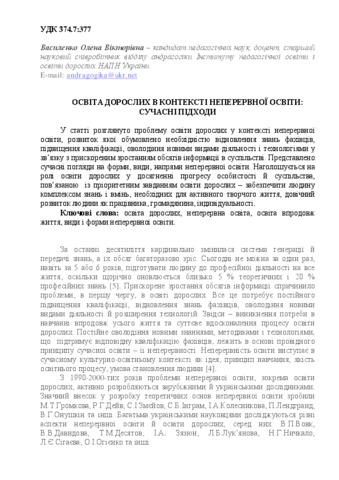 - Василенко, Олена Вікторівна (2014) Adult education in the context of lifelong education: contemporary approaches Освіта дорослих: теорія, досвід, перспективи, 2 (9). pp. 34-42. ISSN 2308-6386