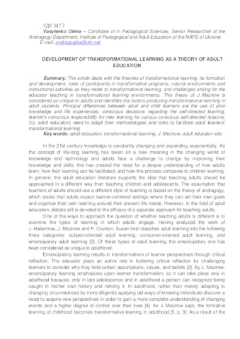 - Василенко, Олена Вікторівна (2015) Development of transformational learning as a theory of adult education Освіта дорослих: теорія, досвід, перспективи, 1 (10). pp. 6-15. ISSN 2308-6386