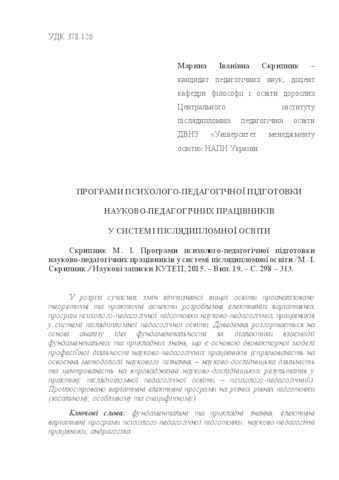 - Скрипник, М.І. (2015) Applications psychological and pedagogical training of teaching staff in post-graduate education Наукові записки Київського університету туризму, економіки і права. Серія: філософські науки, 19. pp. 298-313.
